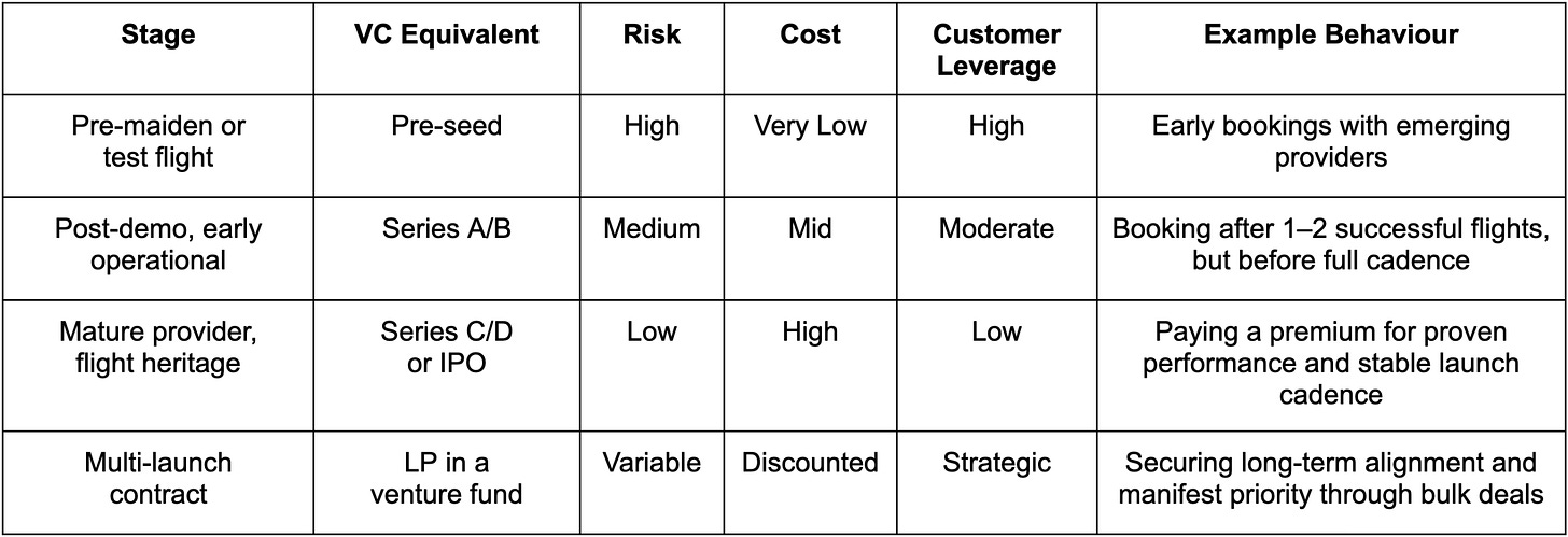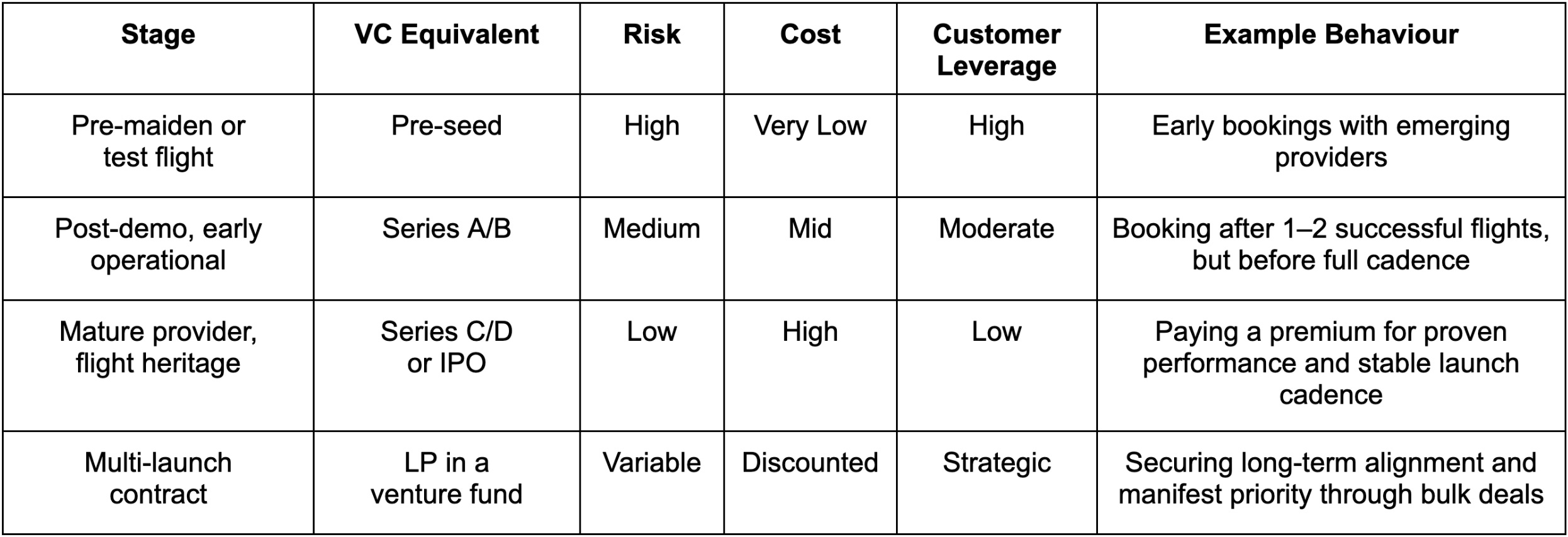 Just like investors choose to enter at pre-seed, Series A, or post-IPO depending on risk appetite, launch customers choose between early-stage and mature providers. Each comes with a different profile of cost, confidence, and control.