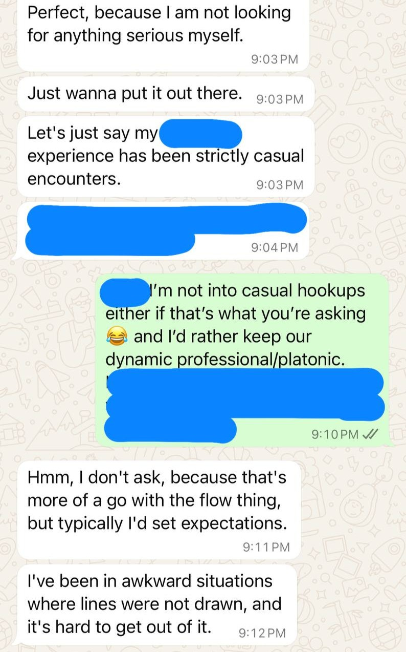 I was cautious. I couldn’t just offend him outright. I had to navigate the situation carefully, trying to shut it down without risking professional consequences.